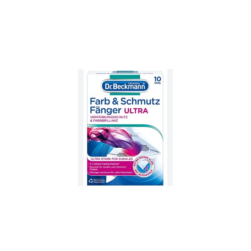Dr. Beckmann chusteczki wyłapujące kolor i wspomagające usuwanie brudu do ciemnych i intensywnych kolorów. Skutecznie wchłaniają kolor z ciemnych i intensywnie kolorowych tkanin zapobiegając zafarbowaniu innych ubrań. Wspomagają ochronę przed szarzeniem, utrzymują żywe i intensywne kolory. Nowa chusteczka wyróżnia się trzy razy grubszą warstwą materiału dzięki czemu wyłapuje do 3 razy więcej barwników.