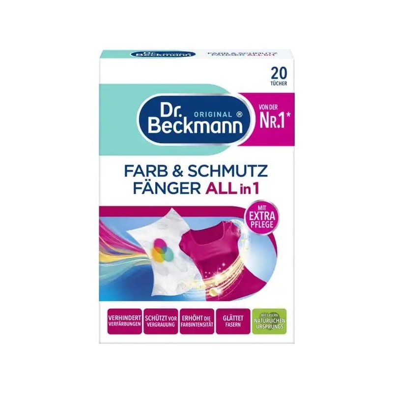 Dzięki połączeniu sprawdzonej struktury z mikrofibry i nowych molekuł wyłapujących barwniki, chusteczki Dr. Beckmann zapewniają optymalną ochronę przed farbowaniem prania. Bardzo drobne włókna mikrofibry zapewniają szczególnie dużą powierzchnię, dzięki czemu barwniki i zanieczyszczenia mogą być szybko wchłaniane z wody i bezpiecznie wiązane w tkaninie.
