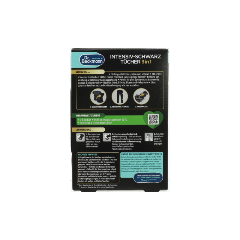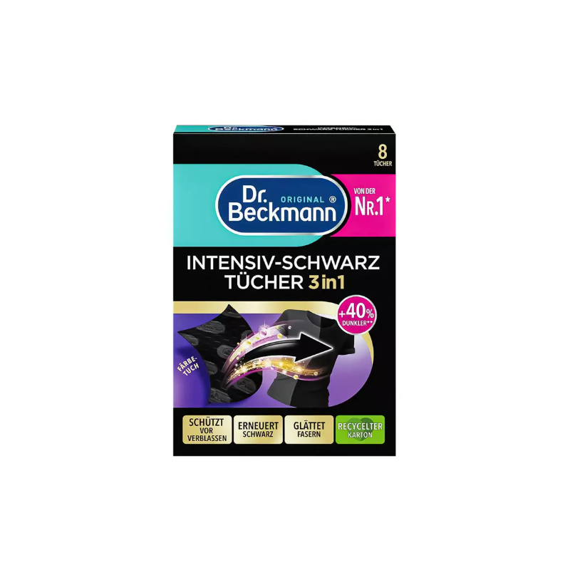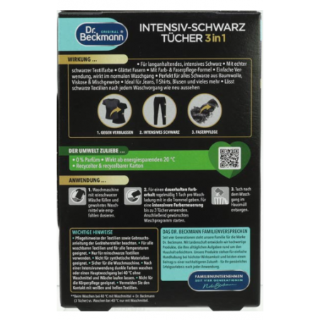 Dr. Beckmann to marka znana z wysokiej jakości produktów do pielęgnacji tkanin. Chusteczki do czarnych ubrań pomagają zachować ich głęboki kolor i estetyczny wygląd na dłużej.