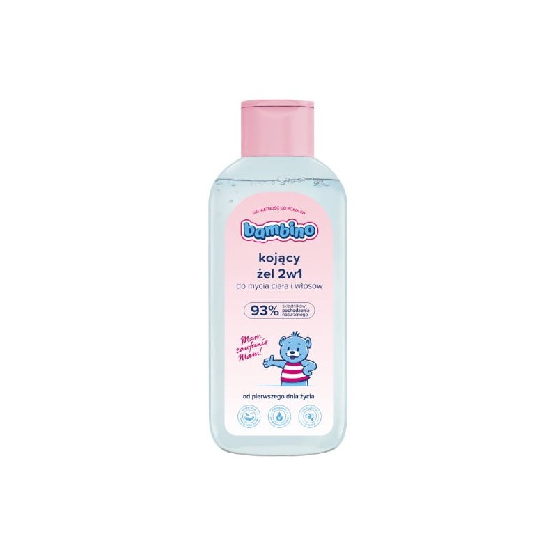 Bambino Żel Kojący do Mycia Ciała i Włosów 2w1 to delikatny kosmetyk stworzony z myślą o codziennej pielęgnacji wrażliwej skóry i włosów.