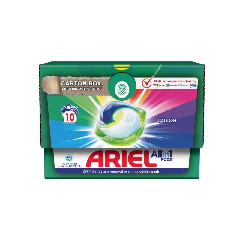 Dzięki praktycznemu kartonowemu opakowaniu z 10 kapsułkami pranie staje się szybkie, proste i bezproblemowe – wystarczy wrzucić kapsułkę do bębna pralki, a reszta zrobi się sama.