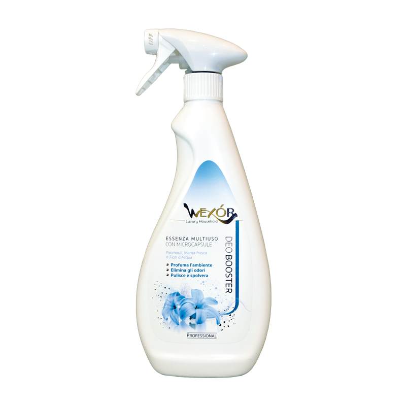 DeoBooster Kwiaty Wodne Wexór to esencja do pomieszczeń o hiperskoncentrowanej formule: kilka rozpyleń w pomieszczeniu gwarantuje niezrównane uczucie „pachnącej czystości” przez bardzo długi czas, dzięki bardzo wysokiemu stężeniu drogocennych esencji i obecności mikrokapsułek.