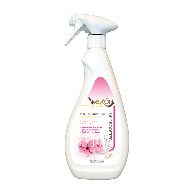 DeoBooster Armonia Rosa Wexór to esencja do pomieszczeń o hiperskoncentrowanej formule: kilka rozpyleń w pomieszczeniu gwarantuje niezrównane uczucie „pachnącej czystości” przez bardzo długi czas, dzięki bardzo wysokiemu stężeniu drogocennych esencji i obecności mikrokapsułek.