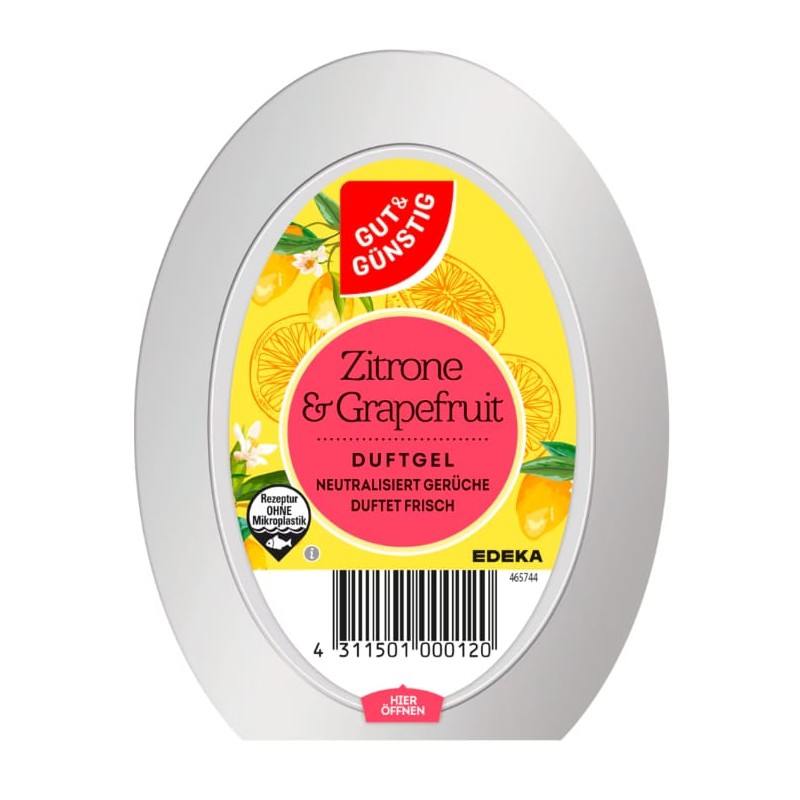 Odświeżacz powietrza w żelu Gut & Günstig o zapachu cytryny i grejpfruta to praktyczny i efektywny sposób na wprowadzenie świeżości do każdego pomieszczenia.