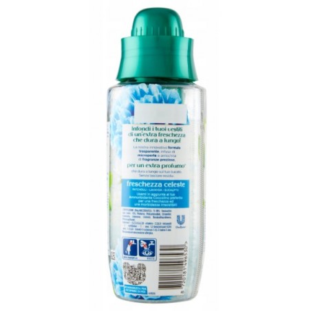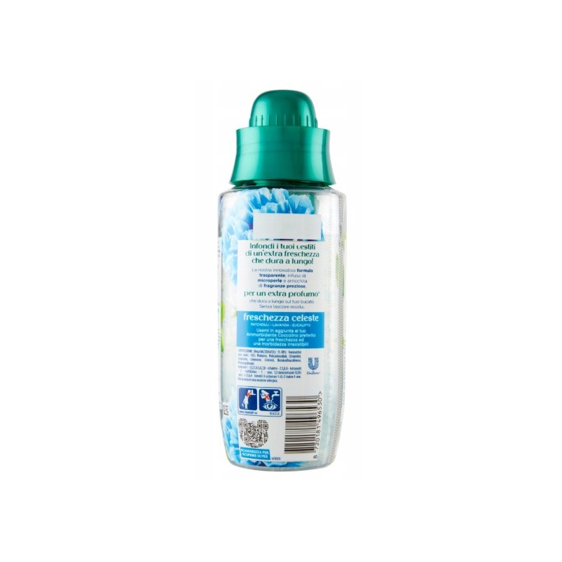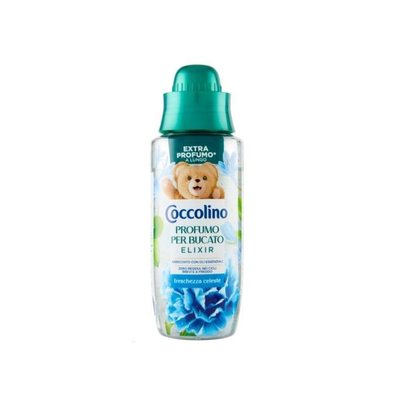 Coccolino Elixir Freschezza Celeste to perfumy do prania o świeżej, lekko kwiatowej kompozycji zapachowej, które nadają tkaninom długotrwały i przyjemny aromat. Skoncentrowana formuła wzmacnia zapach prania, zapewniając uczucie czystości i świeżości przez wiele dni.