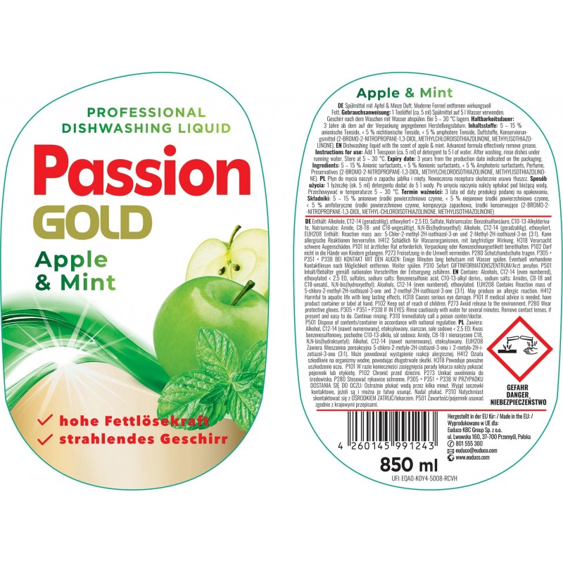 Passion Gold Professional Płyn do Mycia Naczyń Jabłko & Mięta to skuteczny i wydajny środek przeznaczony do ręcznego mycia naczyń. Usuwa tłuszcz, zabrudzenia oraz resztki jedzenia, pozostawiając naczynia idealnie czyste i lśniące. Dzięki przyjemnemu zapachowi jabłka i mięty, mycie naczyń staje się świeżym i przyjemnym doświadczeniem. Formuła została opracowana z myślą o efektywnym działaniu nawet w chłodnej wodzie.