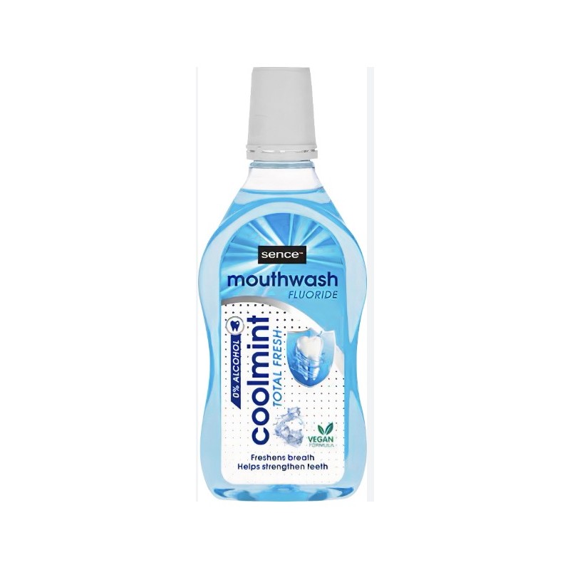 Sence Cool Mint to płyn do płukania ust o orzeźwiającym, miętowym smaku, który zapewnia świeży oddech i codzienną ochronę jamy ustnej. Formuła bez alkoholu z dodatkiem fluoru pomaga dbać o zęby i dziąsła, jednocześnie będąc łagodną dla jamy ustnej.