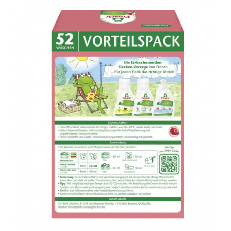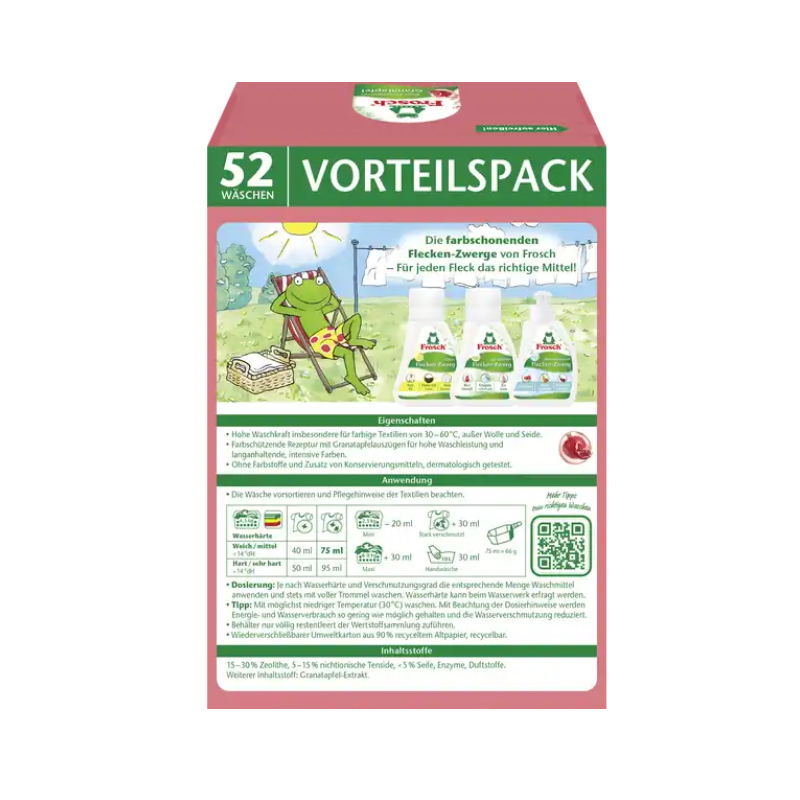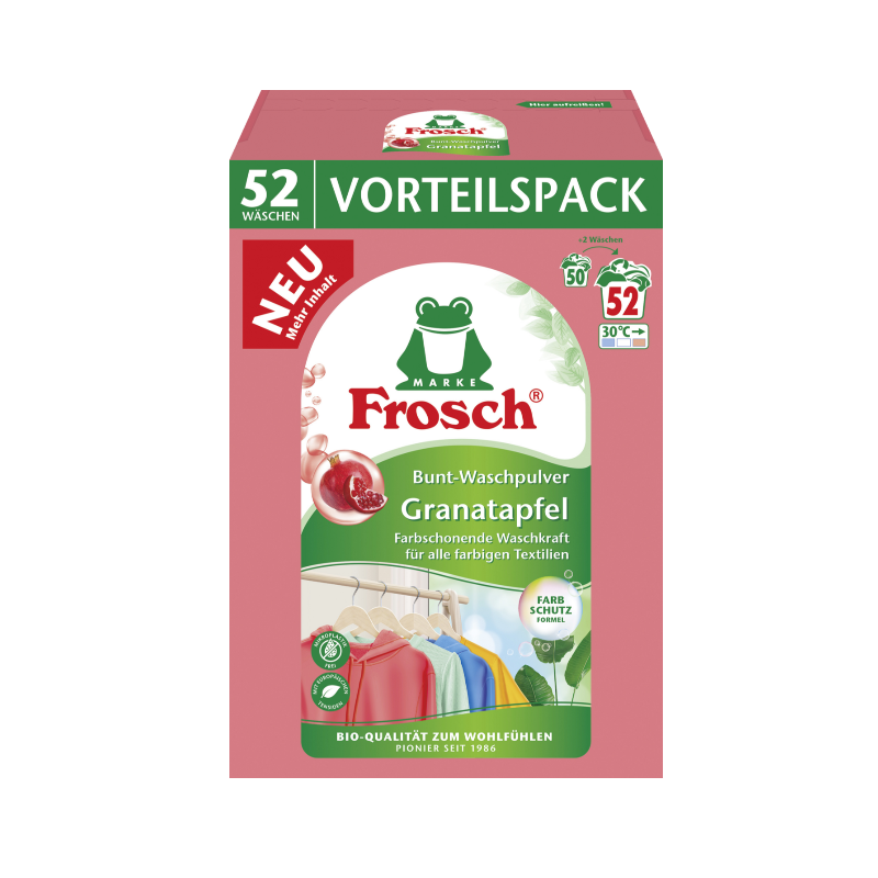 Proszek Frosch Granatapfel przeznaczony jest do prania kolorowych tkanin w pralkach automatycznych i podczas prania ręcznego. Idealny do codziennego prania ubrań, pościeli oraz tekstyliów domowych, zapewniając skuteczne czyszczenie i ochronę kolorów.
