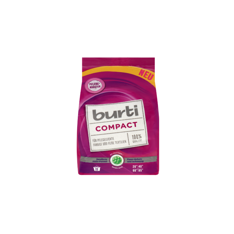 Burti Compact to proszek do prania przeznaczony do usuwania codziennych zabrudzeń z różnych tkanin. Formuła wspomaga utrzymanie świeżości i czystości ubrań, zachowując ich kolory i strukturę materiału.