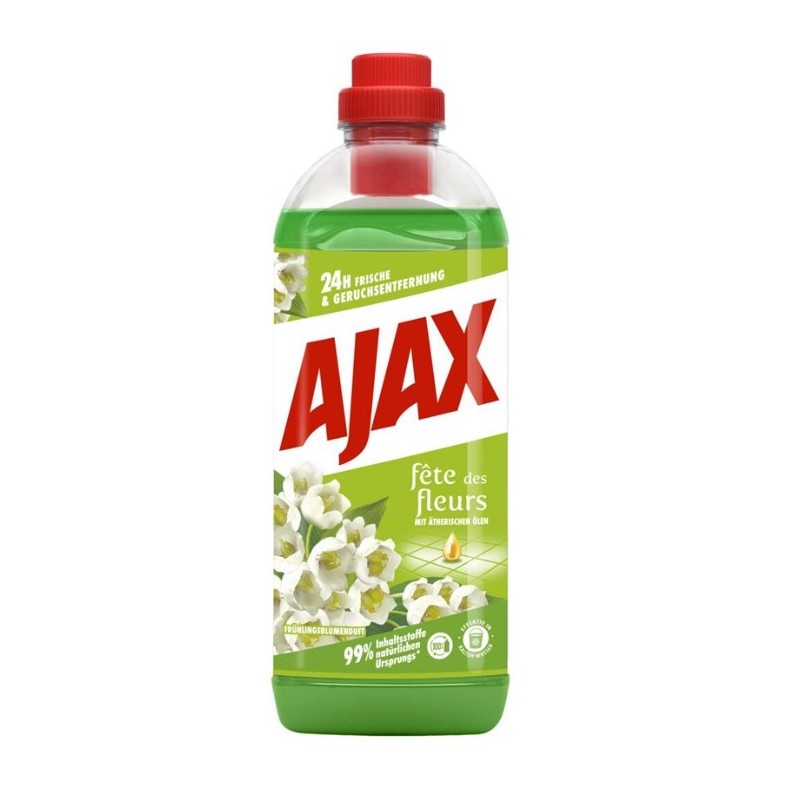 Ajax Floral Fiesta Konwalia to uniwersalny płyn do mycia podłóg i innych zmywalnych powierzchni, który łączy skuteczność czyszczenia z przyjemnym, długotrwałym zapachem konwalii.